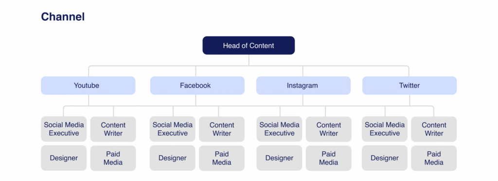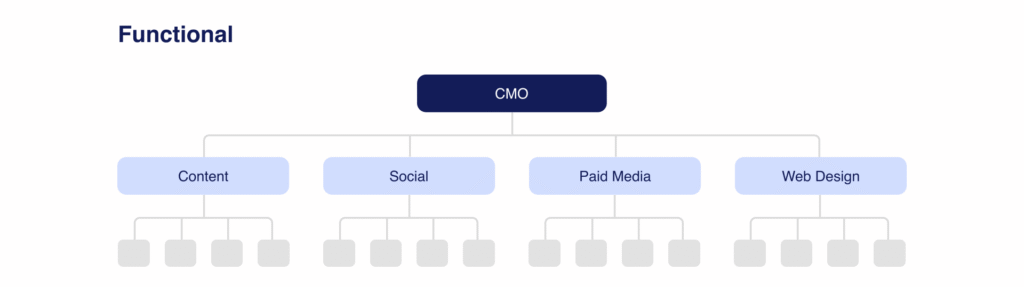 ამ მოდელში გუნდი ორგანიზებულია ძირითადი მიმართულებების მიხედვით. მაგალითად: სტრატეგია, კონტენტი, ციფრული რეკლამა, დიზაინი და პიარი.