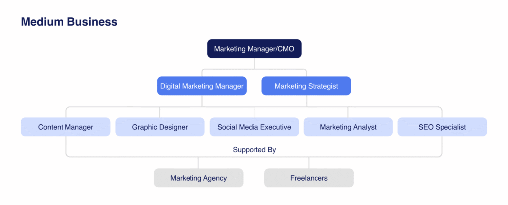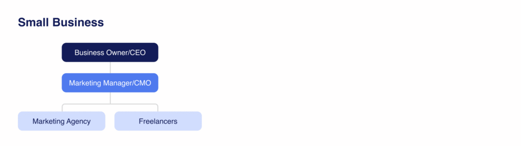 პატარა ორგანიზაციებში თანამშრომლები ხშირად ასრულებენ მრავალფუნქციურ როლებს. მაგალითად, ერთი ადამიანი შეიძლება ერთდროულად მართავდეს სოციალურ მედიას, წერდეს ტექსტებს და ხელმძღვანელობდეს კამპანიებს. ასეთ შემთხვევებში კომპანიები ხშირად ეყრდნობიან გარე პარტნიორებს, სააგენტოებსა და ფრილანსერებს, სპეციალიზებული ამოცანების შესასრულებლად.