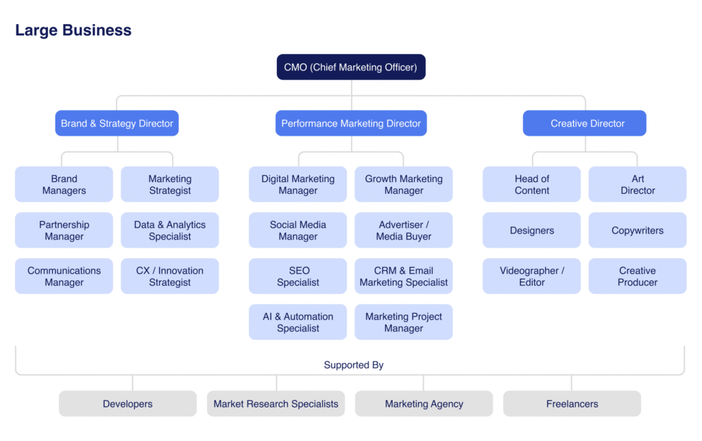 მეორეს მხრივ, დიდ ორგანიზაციებში მარკეტინგის დეპარტამენტი შედგება მრავალი სპეციალისტისგან, რომლებიც კონკრეტულ მიმართულებებზე მუშაობენ: ბრენდინგი, სტრატეგია, ციფრული რეკლამა, დიზაინი, ანალიტიკა და ა.შ. თუმცა, ასეთ გუნდებსაც აქვთ გამოწვევები, რის გამოც მათაც სჭირდებათ გარე სააგენტოებისა და ფრილანსერების მხარდაჭერა.